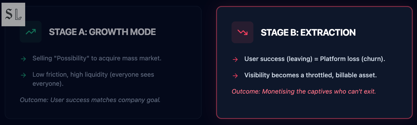 If the app’s cleanest outcome is that you meet someone and disappear, churn is success for you and loss for them. So the business has to find other ways to win: premium tiers, price discrimination, and, most importantly, selling visibility inside the market it controls. Because once distribution is the product, scarcity becomes billable.