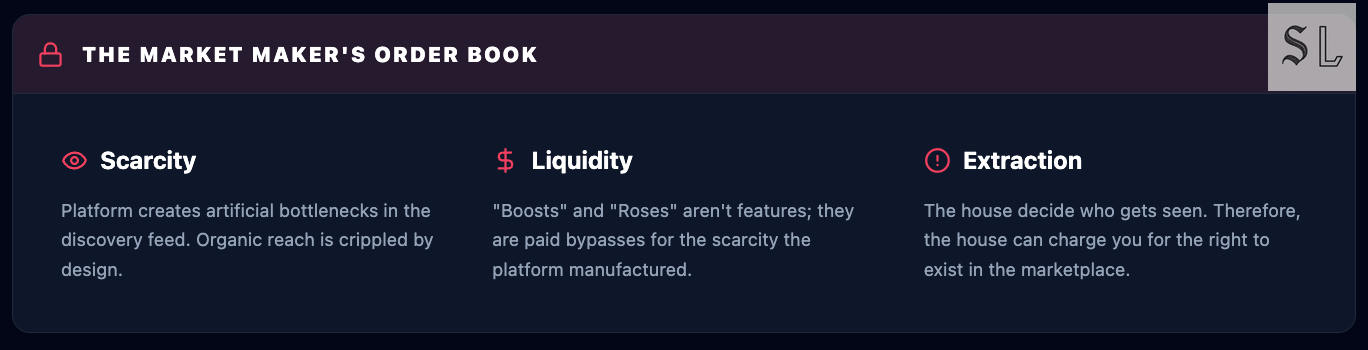 “Boosts”, “Super Likes”, premium queues… these aren’t cute add-ons. They’re paid liquidity in a marketplace where the platform controls the order book. The structure is hard to miss: when the house decides who gets seen, the house can charge you to be seen.