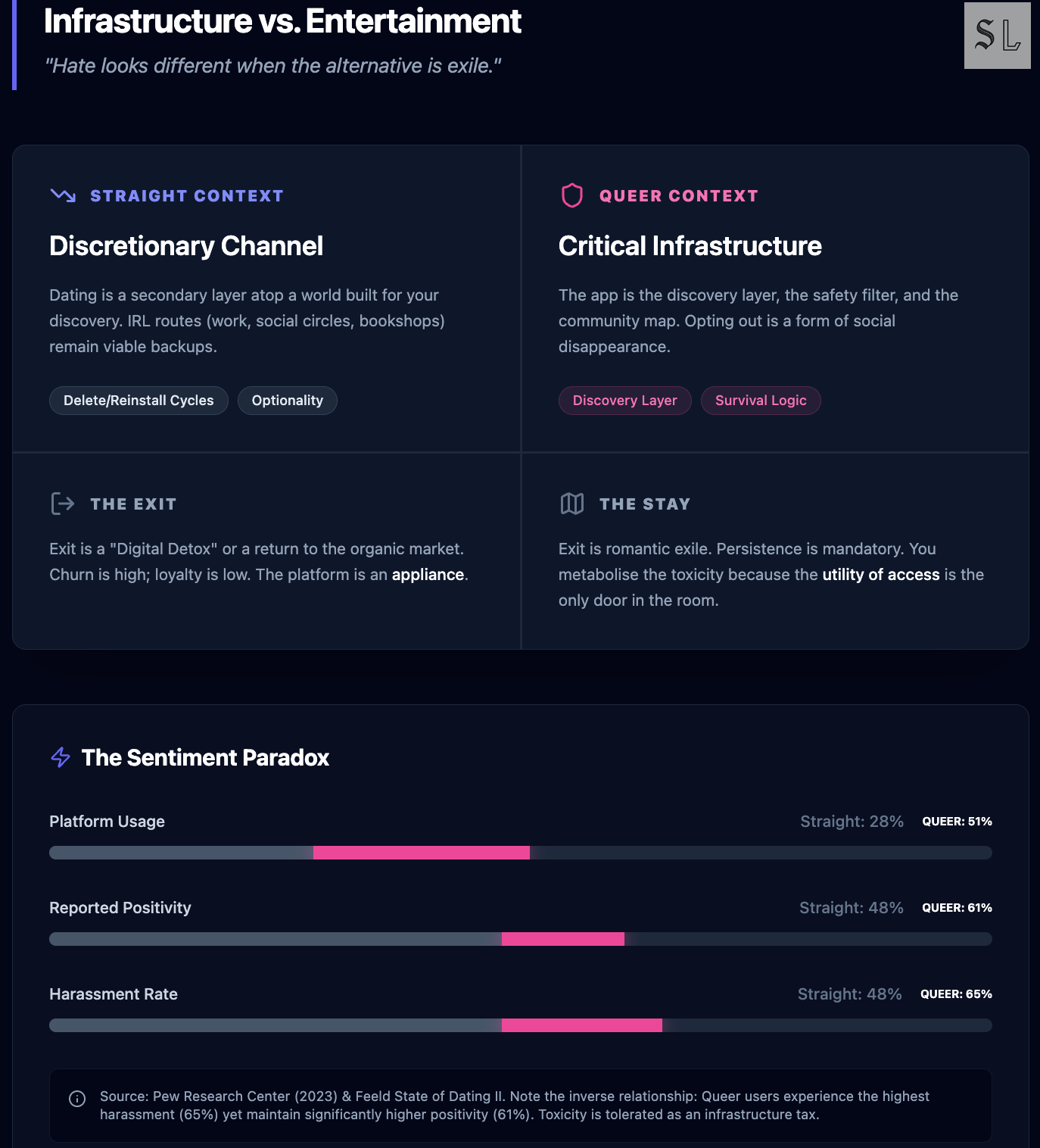 Sections 1–9 mostly describe the mainstream interface: straight dating under platform conditions. That matters because the default product assumptions (who has safe options, who can meet “organically”, who can log off without disappearing) were built around the straight world as the baseline market.