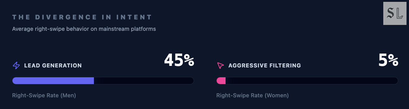 Start with the individual logic. If you’re a man on a mainstream app and your match rate feels like one in 130 swipes, you don’t respond by becoming more discerning. You respond by becoming statistical. You start swiping right on volume (“spray and pray”) because effort without output teaches you to stop treating this like courtship and start treating it like lead generation. (Research puts men at roughly 45% right-swipes.)