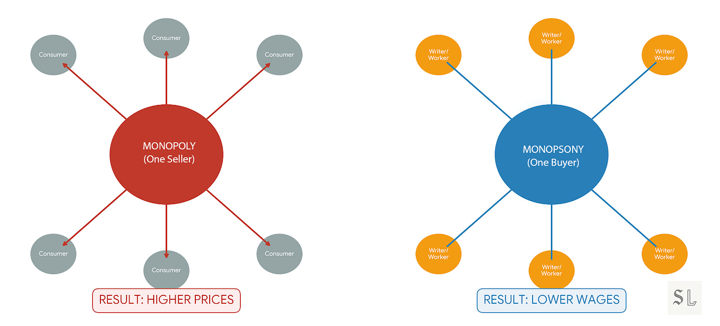 We are conditioned by antitrust laws to fear monopolies: a single seller who raises prices for the consumer. But as former Amazon Studios head Roy Price has argued for years, the structural danger here is a monopsony: a single buyer who dictates terms to the worker.