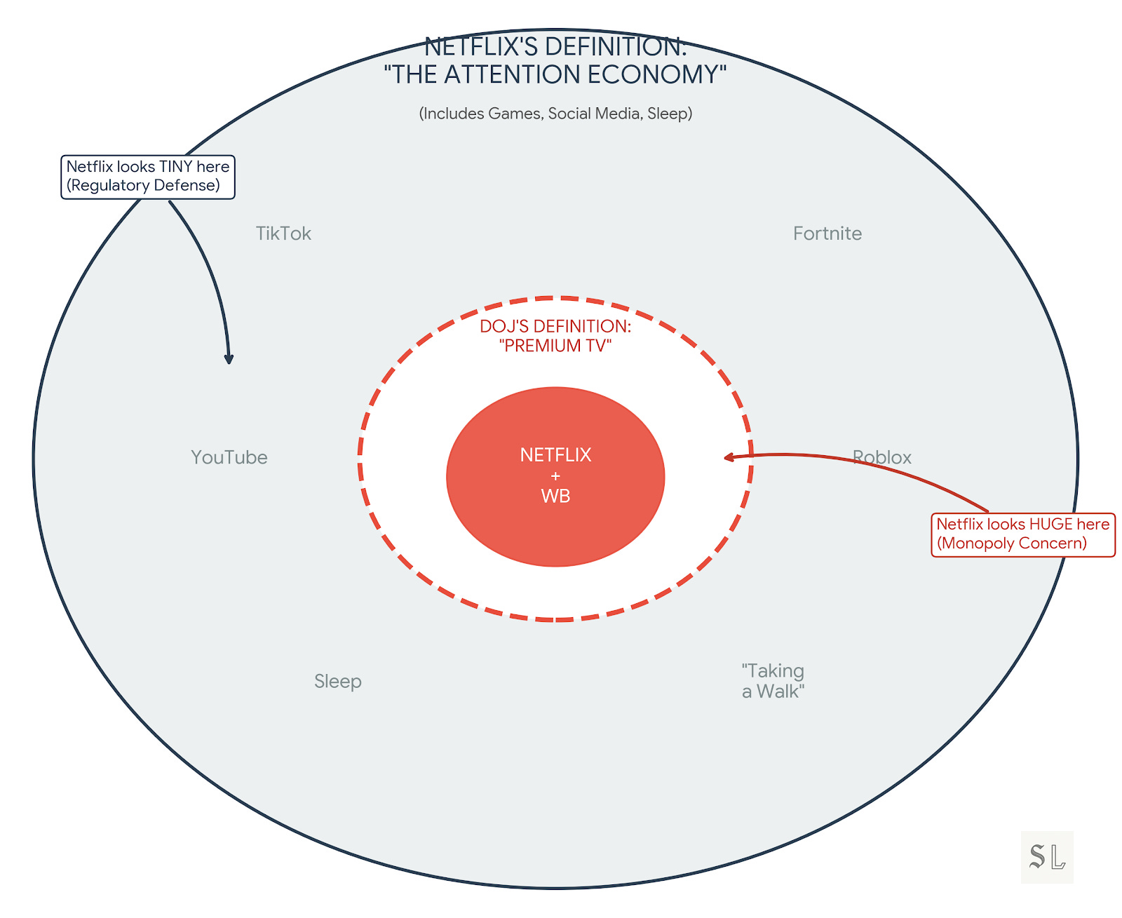 How does a corporation convince the Department of Justice that owning 40% of the television market is not a violation of antitrust law? It changes the definition of the word “market.” This is why Netflix attached a historic $5 billion breakup fee to the deal—they are betting the house they can redefine the law.