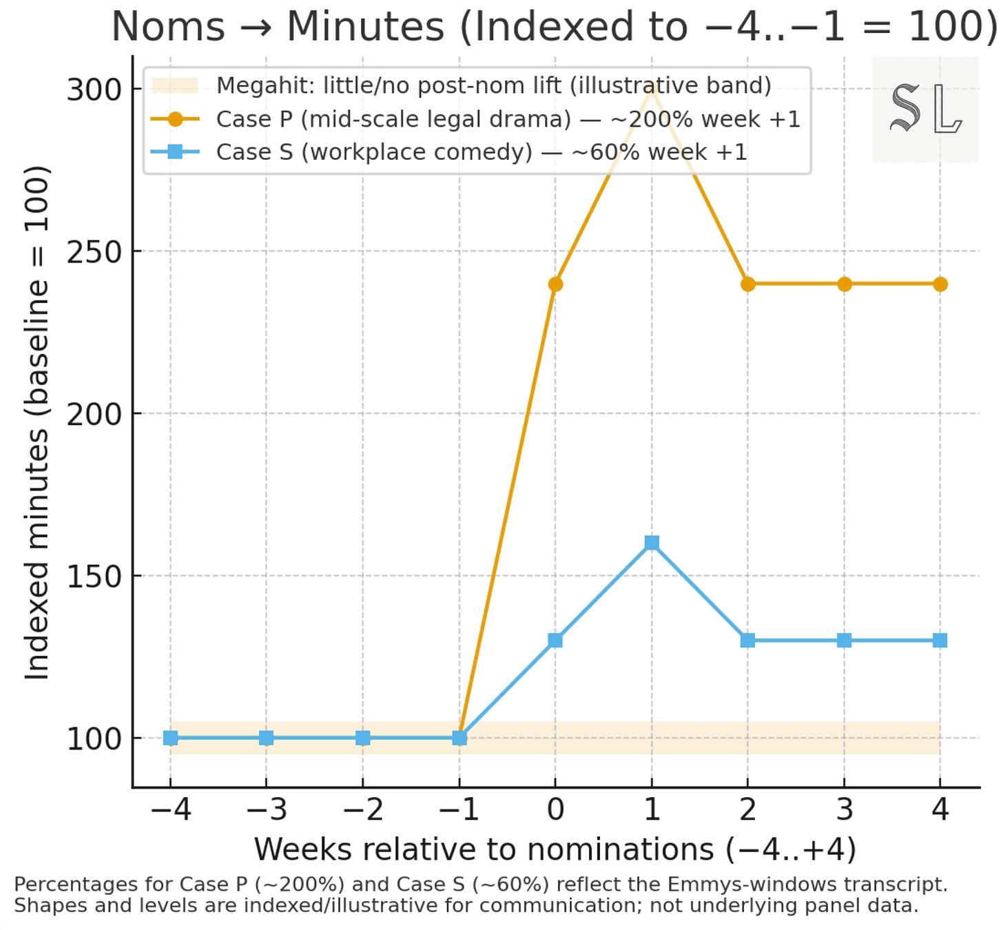 For readers outside the industry: “mid-scale discovery” means well-reviewed series that aren’t yet ubiquitous; “megahits” are the handful of shows everyone already knows. Awards help the former more than the latter because the nomination lowers the perceived risk of trying something new.