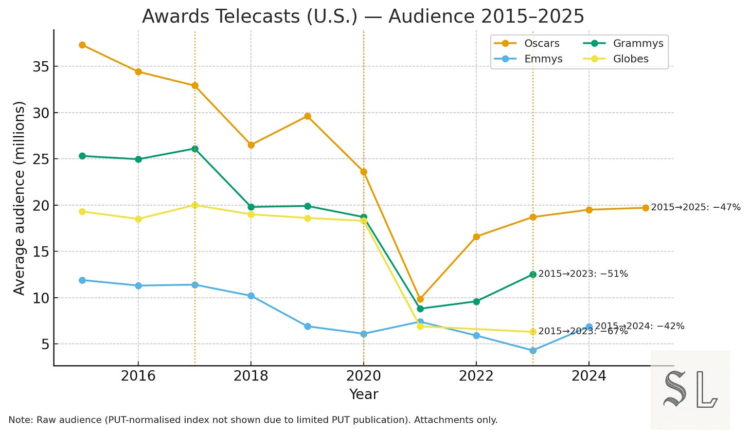 Over the past decade, average U.S. audiences for the big four have fallen sharply (Oscars −47%, Emmys −42%, Grammys −51%, Globes −67%) and a good slice of that slide is simply fewer people watching linear TV at all. A smaller telecast does not tell you whether the awards worked for your titles, simply about the distribution reach.