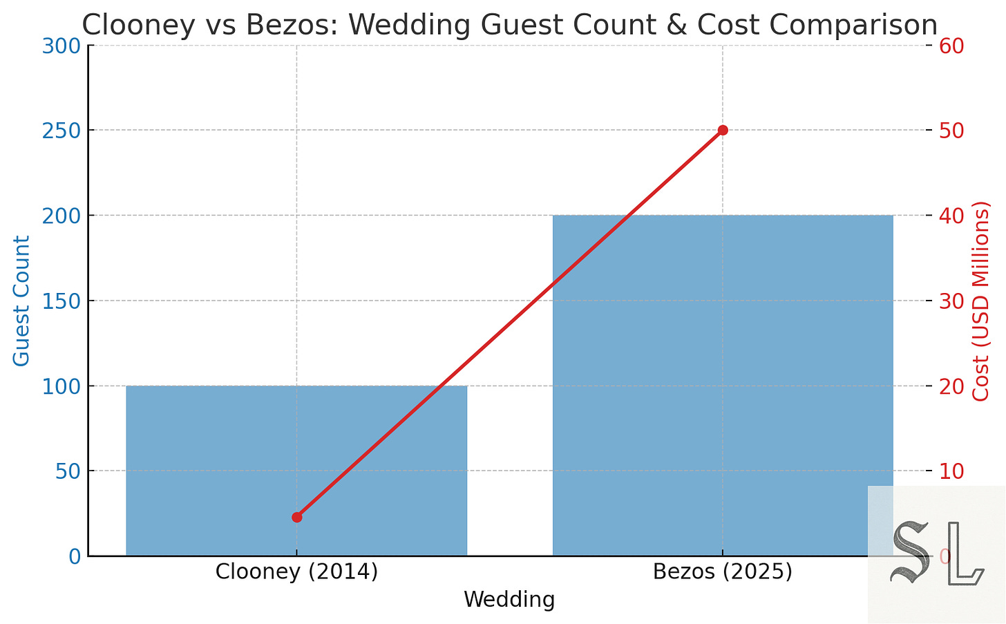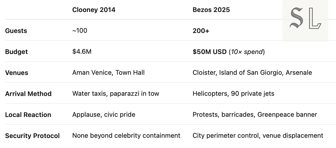 Clooney’s wedding was expensive. Bezos’s was extractive. Clooney invited the paparazzi to document his fantasy. Bezos required a security perimeter and riot protocols.