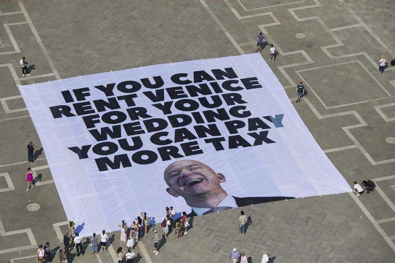 One viral video during the wedding stitched together Bezos in his tux with protesters chanting “Your holiday, our misery.” It got more likes than any official media coverage of the wedding itself.