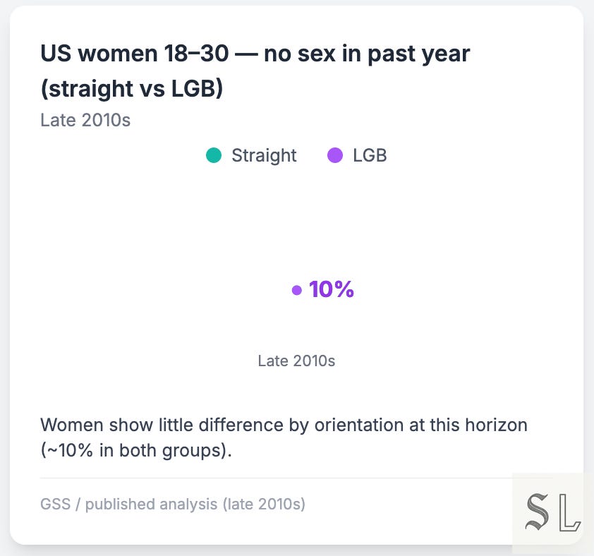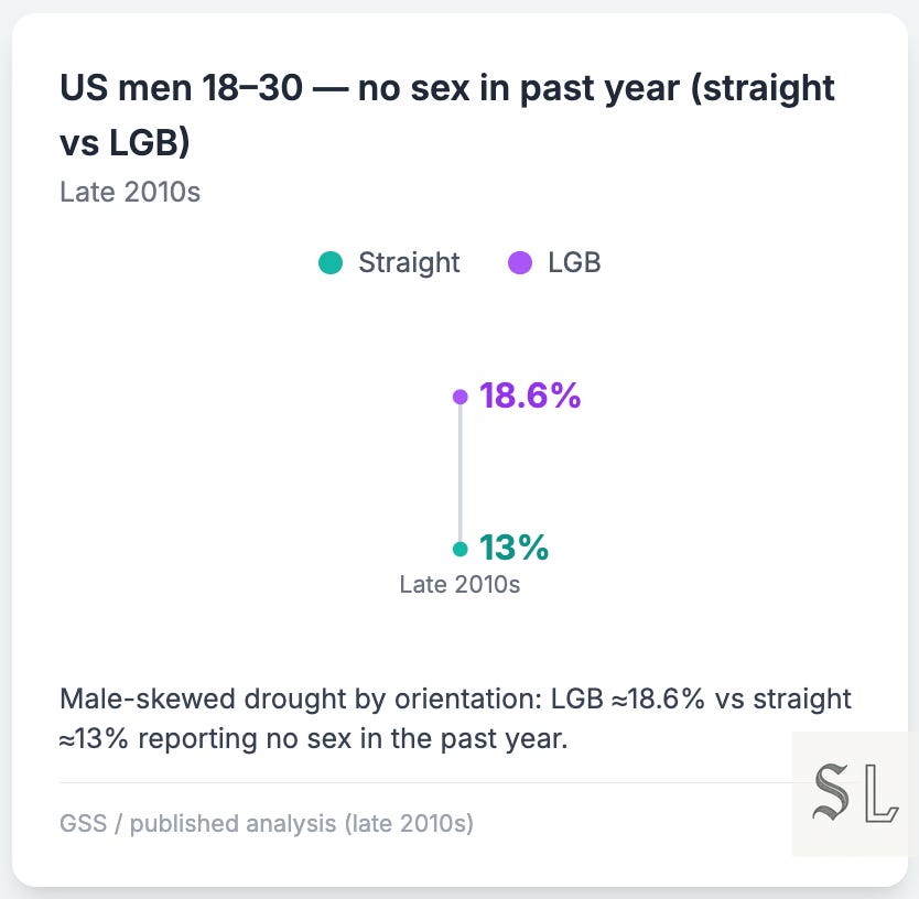Here the gap is clear: LGB ≈18.6% vs straight ≈13% report a dry year. Call it environment and logistics — minority stress, scene closures, app roulette. Not a “Grindr tax”, exactly, but the path to partnered sex is rougher. Small-N, direction holds.