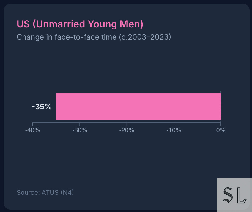 Mind the male skew. Less in-person time maps to the sexlessness gap and thinner friendship nets. If you want fewer problems later, give the lads more places to be.