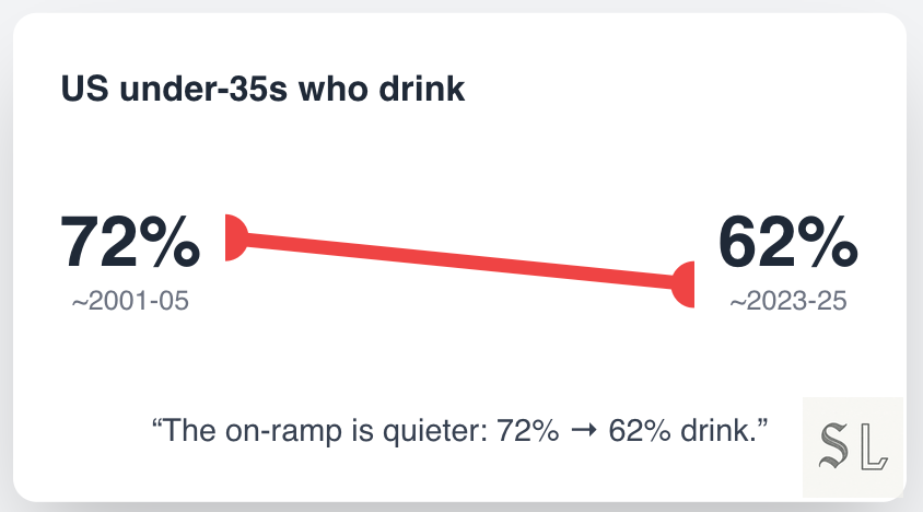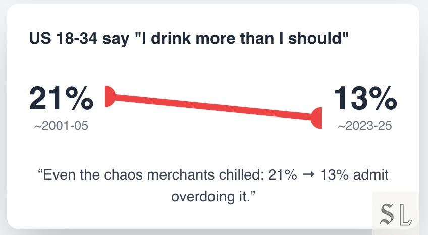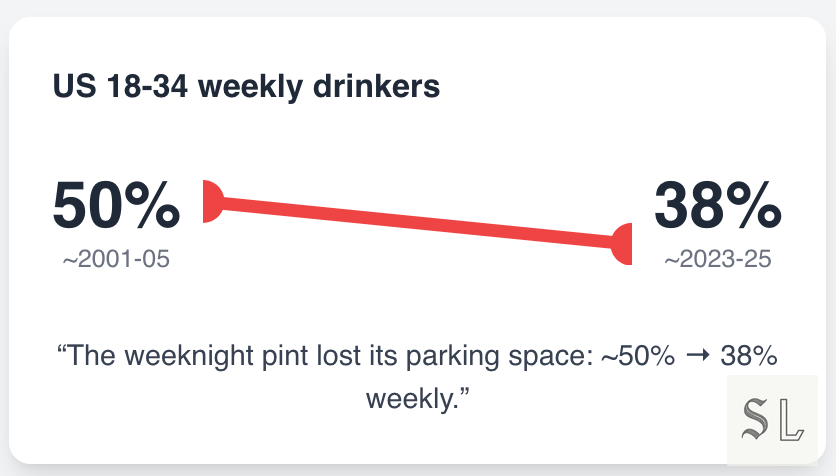 This is not Dry January cosplay. Fewer young people start, those who do start drink less often and less heavily, and routine pints lost their slot to planned occasions. That’s why your Friday looks quiet and your festival looks feral: the cadence changed.