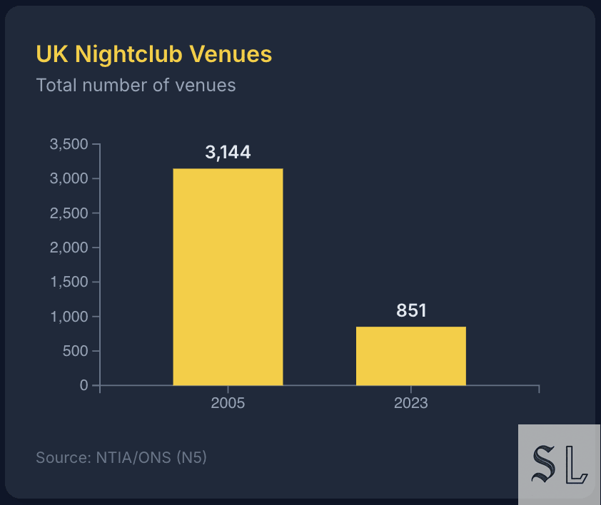 Supply matched demand. A roughly three-quarter cull of UK clubs since 2005; fewer weekly dance floors, more one-offs.