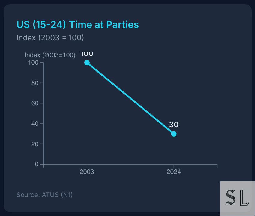 Party time collapsed. ~70% down since 2003; “out” became an exception, not a habit.
