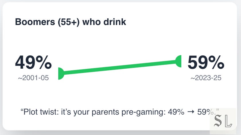 The drinking script flipped. The heaviest drinkers are Boomers now. Twenty-somethings treat control as status and hangovers as unforced errors.