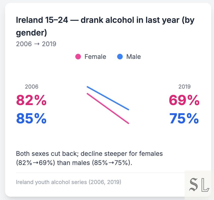 Women are setting the speed limit. They’ve stepped back from alcohol faster (UK and Irish trends show the sharper drop) and teenage girls in England have almost caught boys on not drinking at all. Bingeing fell on both sides, but the last stubborn outliers are mostly male.