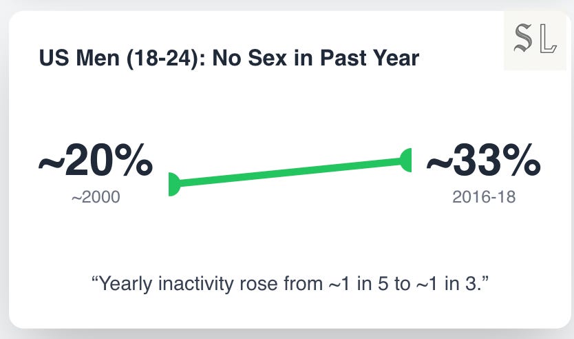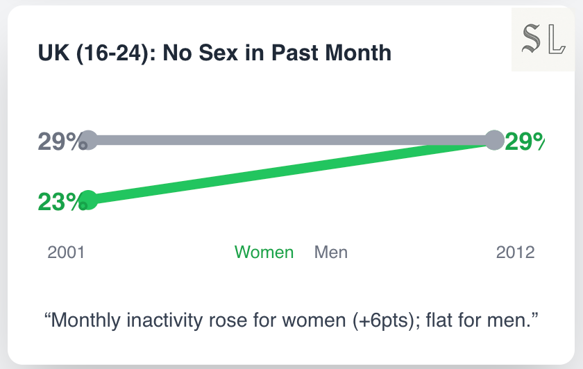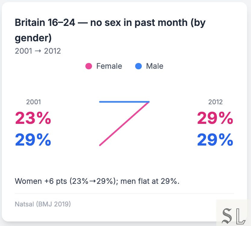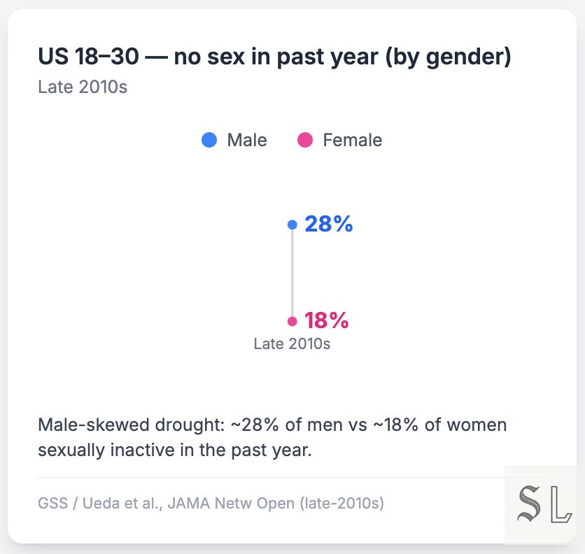 The dry spell in sex is concentrated among men. By the late 2010s, roughly a third of American men aged 18–30 reported a dry year, versus about a fifth of women. In Britain, the steepest fall in sexual frequency shows up inside older or married couples; 16–24 men are flat, which is to say they started lower and stayed there.