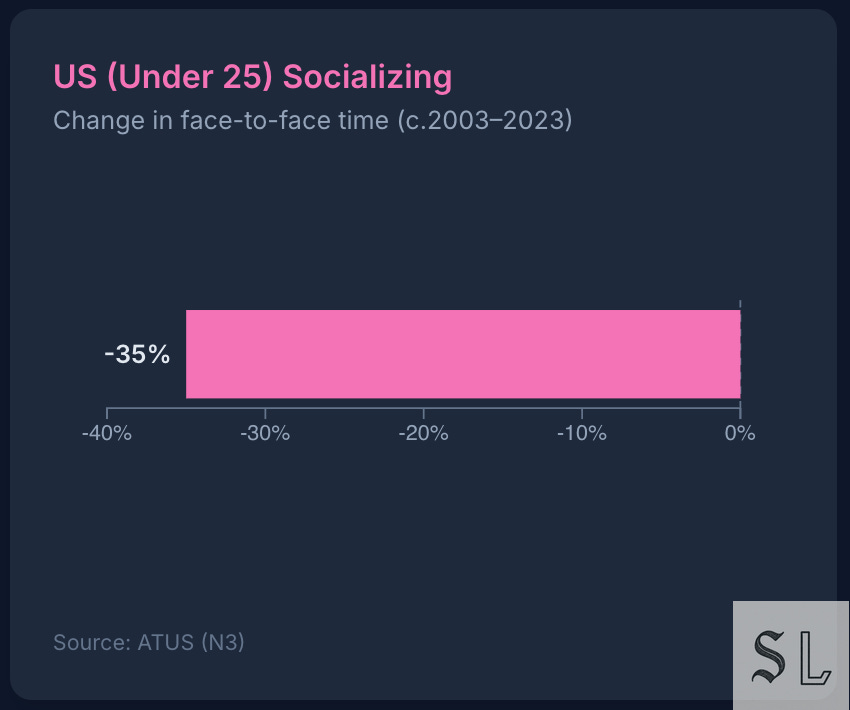Offline time fell by ~⅓. Screens ate ambient socialising; chance drinks and chance encounters shrank with it.