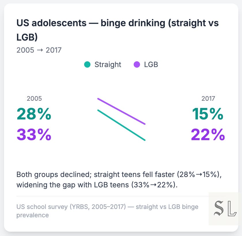 Both lines fall. Straight teens drop 28%→15%. LGB teens drop 33%→22%. The gap widens because straight kids cut back faster. Read: the moderation wave reached everyone, just not at the same speed — queer youth still face different pressures and venues, so the tail lingers.