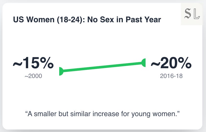 Smaller rise, same direction (women). Women remain more likely to be paired, which is why the gender gap drives so much of the “sex recession” story.
