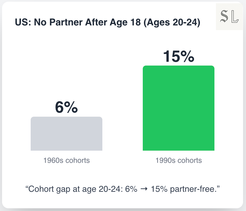 Cohort effect in one glance: 1990s-born young adults were 2.5× more likely to reach 20–24 without a single partner than 1960s cohorts. That’s not late blooming.