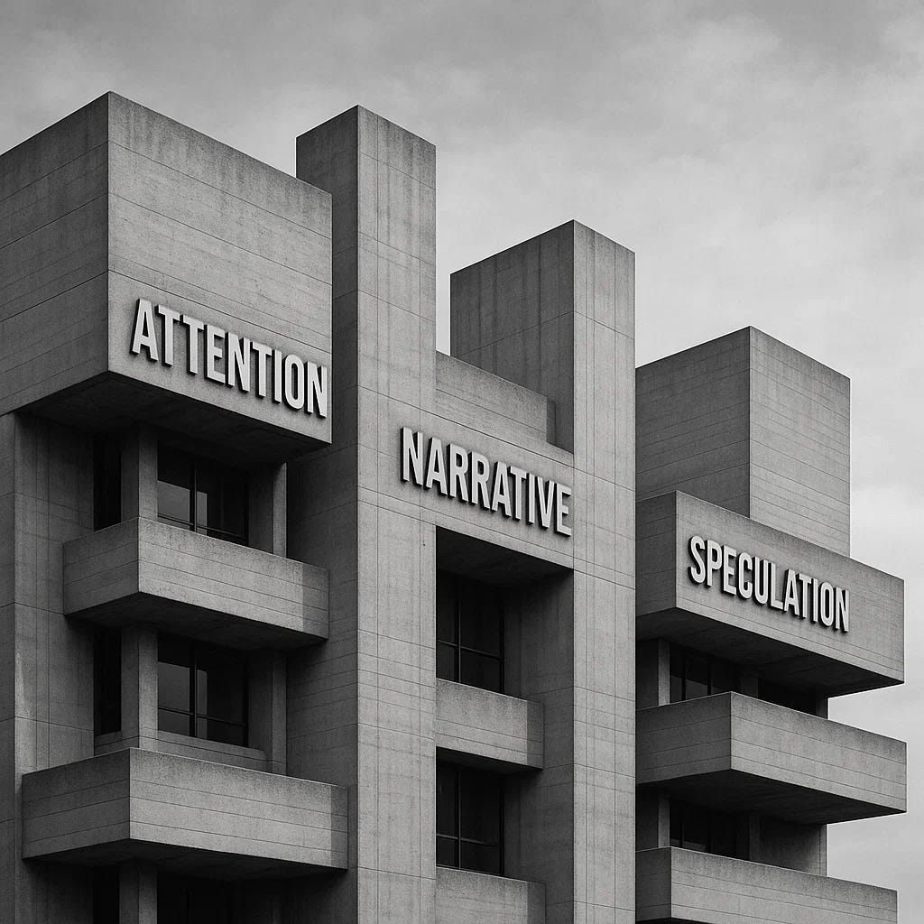 The Architecture — The conveyor belt: Attention → Narrative → Speculation → Capital. Four layers, three transforms, one open-air casino. Your boredom in, someone else’s yacht out.