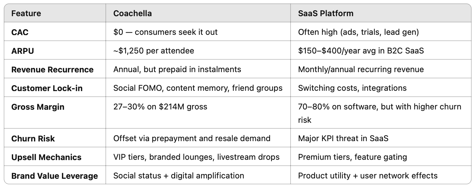 The comparative unit economics are startling. Coachella’s average revenue per user (ARPU) is $1,250+ per attendee, far outpacing the B2C SaaS median. And while SaaS platforms fight to retain users with dashboards and Slack integrations, Coachella does it with sunsets, social proof and scarcity theatre.