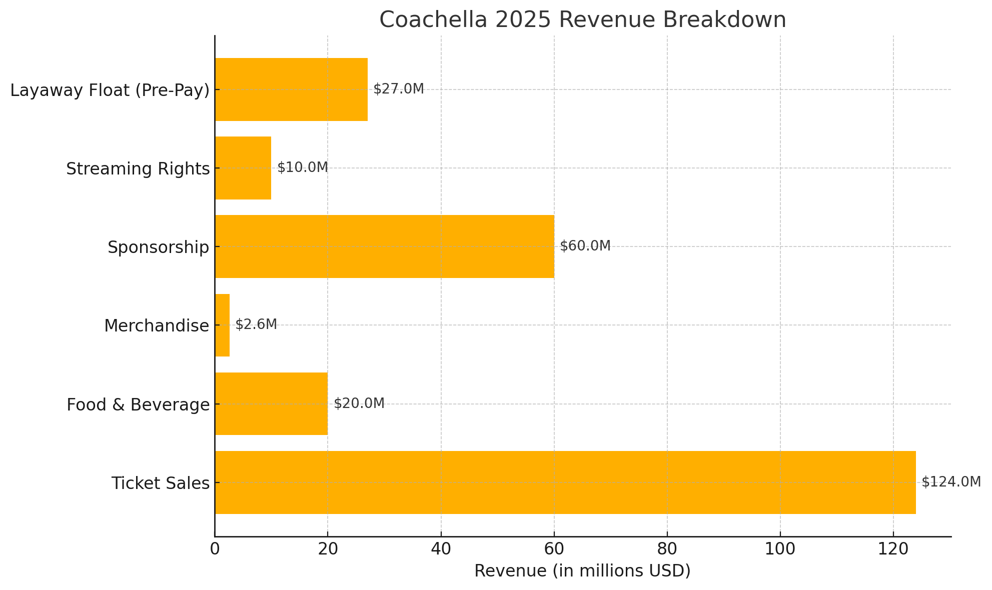 60% of general admission attendees use Coachella’s layaway system: $99 down, four further payments and a ~$27 million advance float across the cycle.